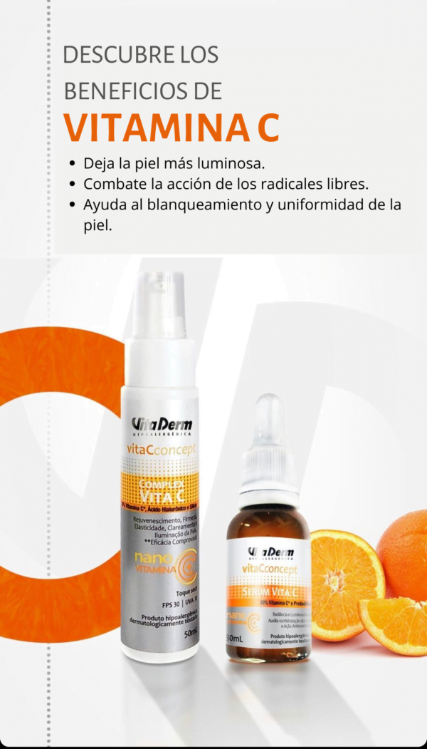 Sérum reductor de líneas para todo tipo de pieles. Vita Derm Vita C Concept Complex actúa para mejorar la firmeza, la elasticidad, igualar las imperfecciones e iluminar la piel.